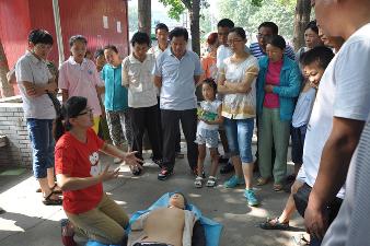 在新乡华北石油局新乡社区站,场面依旧热烈火爆,当天早上下雨,天气湿热,但居民的热情依然,整个活动时间从早上8点持续到中午11.30,前来接受服务的居民络绎不绝,有的老人因为用过早餐志愿者就建议他两个小时后再来测量血糖。该社区的人员因为工作性质长年野外工作,他们对紧急救援表示出极大的兴趣,仅此项示范培训就进行了近五轮,有父子一起来学习的,有女士来学习的,还有多位老人亲身实践。志愿者们的行为也感动着我们身边的人,药学院一位老师的爱人是学中医的,被我们所感染也积极参与到活动中,为老人把脉、问诊,进行中医方面的咨询和解答。有位老大爷多次竖起大拇指,对活动赞不绝口,一直表示恳切地希望我们每年多来几次。