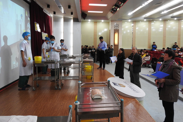 大赛在《急诊科医生》中一段残酷车祸现场视频中拉开帷幕。选手们疾步上场马上进入急救状态,“先生,先生,你怎么了”,“意识丧失,无心跳呼吸,马上抢救”,“请帮我拔打120”……呼救、评估、通气、按压,一幕幕惊心动魄地抢救画面展现在观众面前。选手们手法娴熟,沉着冷静,动作规范,严格按照操作流程,认认真真地对待每一步操作,在规定时间内快速准确地完成了所有动作,表现一名医务人员良好的对突发事件的应急处置能力。在穿脱手术衣戴无菌手套项目中,选手和助手默契配合,整体抓起、提起内面衣领、抖开、向上轻掷、前臂伸入、向前平伸……,严格遵守无菌要求,一丝不苟。切开缝合术操作时,虽然只是一个模块道具,但选手从核对病人、遮挡隐私、清创、固定,再到观察、询问、安慰,认真的态度完全就像是在为患者做一台手术。整个操作程序准确而流畅,不但展示高超的专业技能,还展现出作为医者的高尚的人文素养。在三个单项比赛的全过程,每到选手操作的关键步骤时,整个会场400多名观众双眼紧盯大屏幕,摒弃凝神,鸦雀无声,而当一个精彩的操作完成后,台下顿时掌声雷动,“哇,好棒啊”一片赞叹之声。台上观摩的评委们,不停地变换角度仔细地观看选手的每一个的动作,面露欣慰之色,不住点头。
