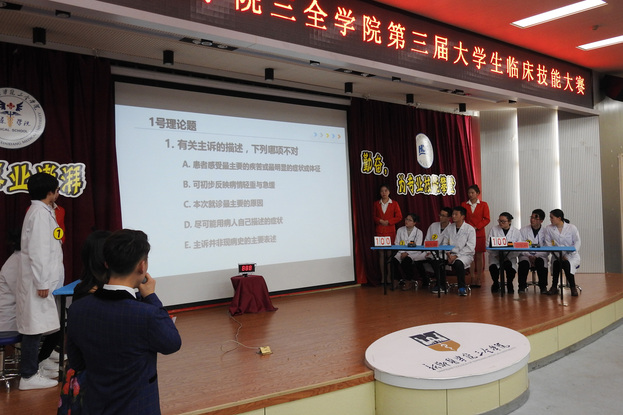 单项操作比赛结束,两位主持人一段轻松幽默的rap小段和学生科普小组带来的《洗手舞》,观众不禁跟着节奏拍起打其拍子,感受不一样的专业魅力。随后,进入知识竞答和分析判断环节,三个书院代表队队员们精神抖擞,志在必得。在图片判断和视听分析等环节的比拼中,既有必答题又有抢答题,既有得分题,又有扣分题,这不仅考验选手们扎实的理论知识,考验他们的临床思维能力和病例分析能力,更考验他们的团队协作精神和集体责任感。在一些知识点存有疑惑的地方,评委老师结合临床实际进行现场评析,观摩的同学学到了知识,解决了问题,享受了一场别开生面的专业学习的盛宴。