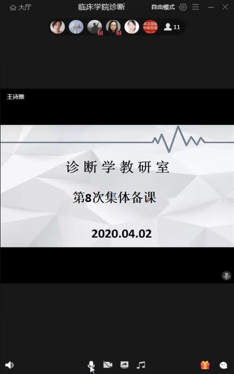 试讲结束后,全体教师进行了集体备课。谢主任强调了在实验课授课过程中,一定要多互动,多提问,通过互动和提问,去检验同学们理论知识掌握的情况,并让同学们在自己分析心电图卡片的时候,找到自己的知识短板,并督促自己进行学习。同时也强调了在网络授课的时候,如果自由模式出现网络故障,可以调换为主持模式,或者语音通话+截图的模式进行。