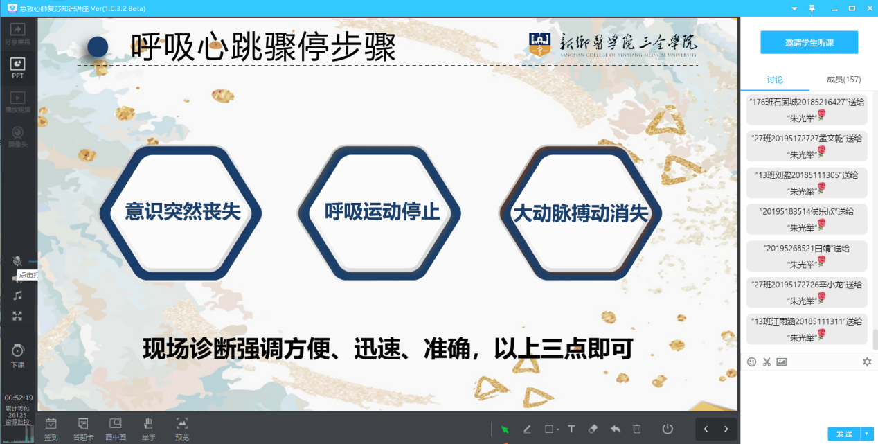 为增强广大医学生的急救意识,普及医学急救知识,6月5日下午,借助互联网形式,通过腾讯课堂平台,临床学院外总教研室朱光举老师受邀开展“急救心肺复苏术急救知识讲座”为主题的急救知识讲座。本次活动由临床学院主办,大健康服务协会承办,各专业学生参与了本次活动。