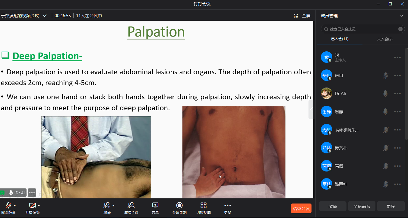 为严格遵守疫情防控工作要求,此次预试讲采用钉钉会议进行线上讲授。首先由Dr. Frida Mumtahana进行30分钟的预试讲,其详细讲授了基本检查之视诊、触诊、叩诊、听诊的基本方法及注意事项,简单讲述了嗅诊的内容。试讲结束后,谢老师表示其言语流畅,课件内容详略得当、重点突出、图文并茂,能够很好的帮助同学们理解记忆,同时指出课件中存在的问题。岳冉老师对出现的问题予以补充,并给予正确展示。Dr. Frida Mumtahana虚心接受并给予改正。