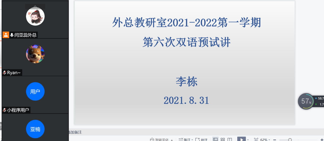 8月31日上午,外总教研室开展第7次线上集体备课及第6次双语预试讲活动,本次活动由外总教研室副主任朱光举主持,外总全体教师参加。