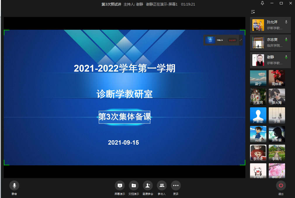 为不断提高青年教师授课水平,提高线上教学的授课质量。9月15日上午,诊断学教研室第3次青年教师预试讲活动在企业微信上如期开展,活动由副主任谢静主持,教研室主任严新志及全体教师参加。