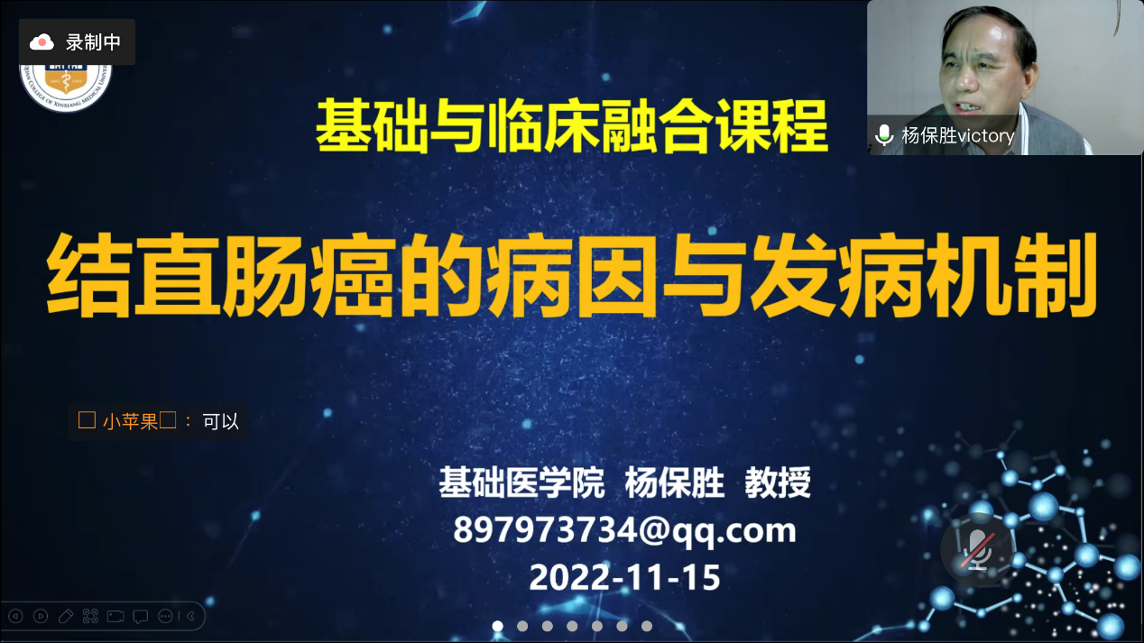 杨保胜教授以“20世纪医学技术的三次革命”为切入点,讲解了肿瘤发生的分子机制、结肠癌的病因以及发病机制,授课过程形象条理,对重点知识讲解的十分清晰,课中合理运用答题环节,调动老师和同学的积极性,引导进行思考,课堂氛围活跃。