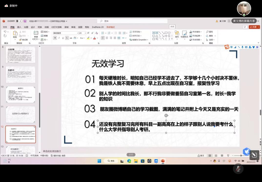 为帮助临床医专业学生做好学业规划,提高学生考研积极性,2月23日,临床学院以线上的方式举办了考研经验分享会。会议由临床学院外科学课程中心教师刘亚楠主持,活动特邀请了2022年成功上岸西安交通大学医学院的优秀学生黄文博做了经验分享,参与活动的有大三、大四学生近370人次。