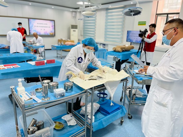 赛场上,选手们娴熟的临床实践技能、敏捷的临床思维能力和默契的团队配合有条不紊地进行着步骤繁多的临床技能操作,每位同学都展现自己最佳的风采;评委们全神贯注一丝不苟,对参赛选手的每一个细节动作都严格认真地进行核对确认及评价打分。