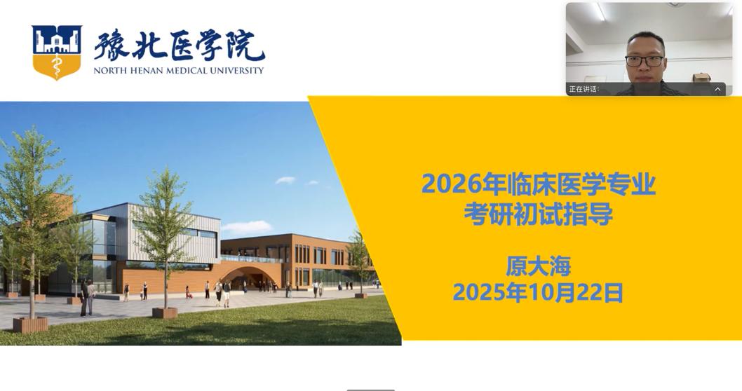 10月22日,临床学院通过腾讯会议平台举办2026年临床医学专业考研初试指导讲座,教师原大海围绕 “复习策略、心态调整、考场应对” 三大核心模块展开讲解,为备考学子送上精准冲刺指南,帮助大家高效备战初...